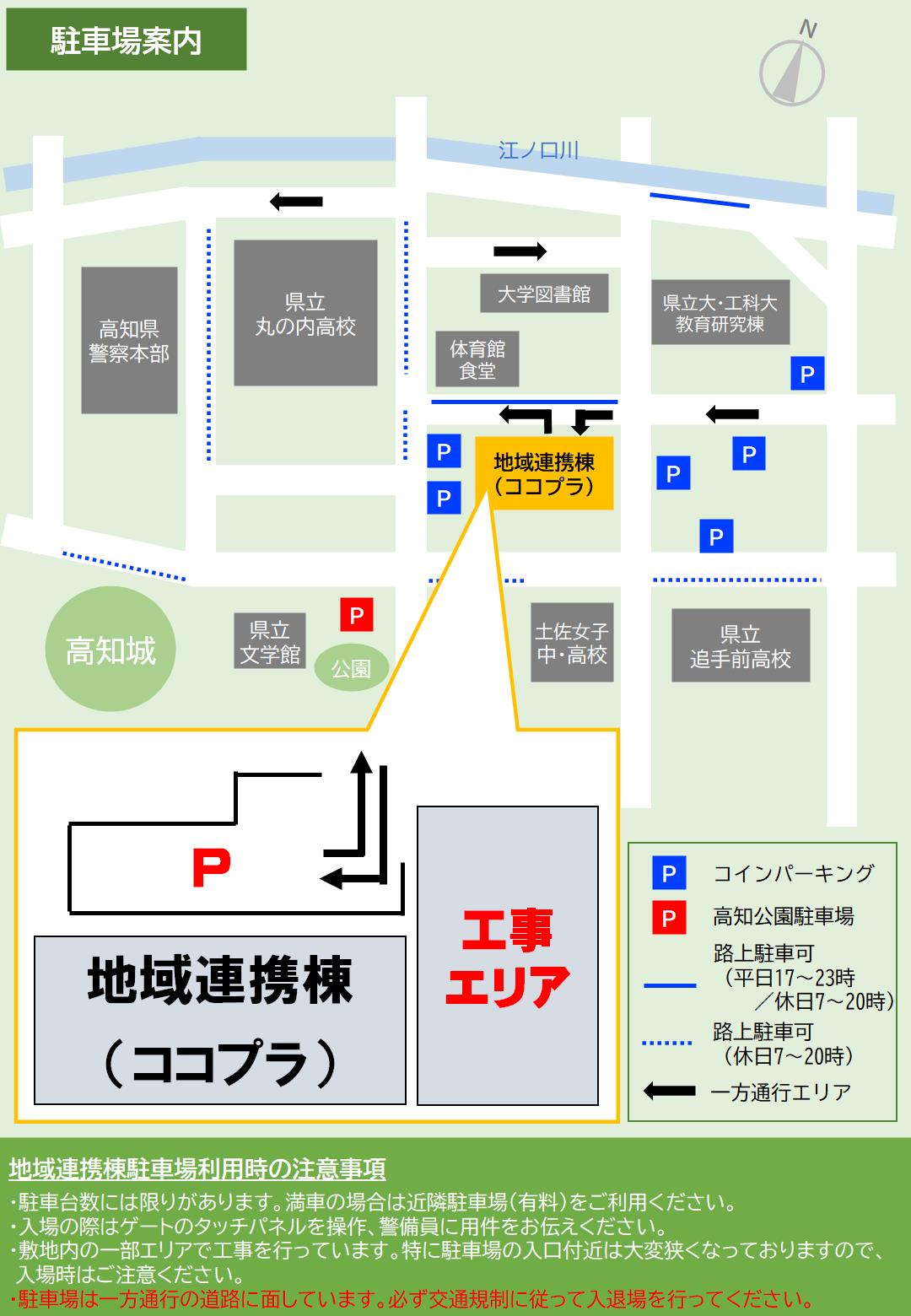 - 左記の図の位置の駐車場(15台程度)を利用可能ですが、地域提携棟への他の来客の方も利用しており、台数に限りがございますので、公共交通機関での来場にご協力をお願いします。