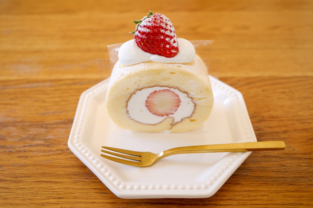 写真:シフォン生地を使った「いちごのロールケーキ」。ロールケーキのために作るこだわり配合の生クリームと、フワフワしっとりのスポンジ、甘酸っぱい黒潮町産いちごの相性は抜群。
