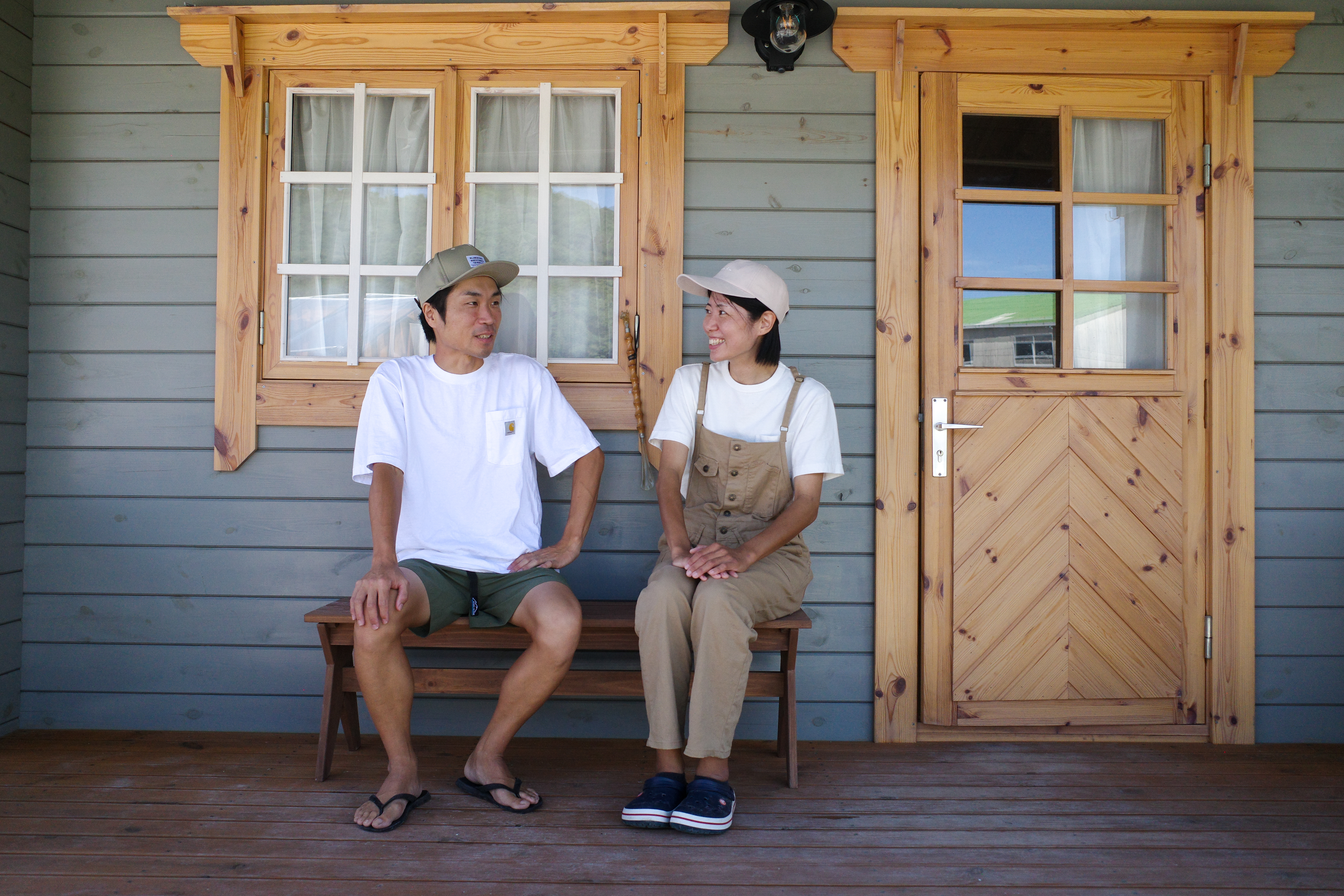 写真:2人で建てた小屋の前で。