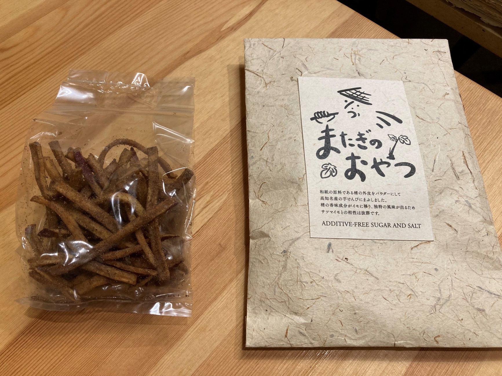 令和3年3月に立ち上がった「KOUZO」では、土佐和紙の伝統を守り、広げるために和紙原料以外の破棄されていた楮※を使った芋けんぴやパウダー、スノーボールクッキーを販売されています。