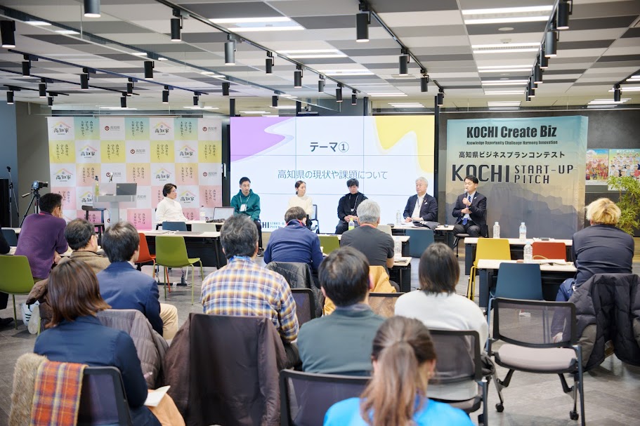 その後は審査員たちが登壇しパネルディスカッションを展開しました。「高知県の現状や課題」「地域資源を活用した事業展開の事例」から「起業家が直面する課題と成功事例」まで、幅広いテーマで議論が交わされました。特に事業展開における「継続力」の重要性については多く語られ、参加者たちは熱心に耳を傾けていました。